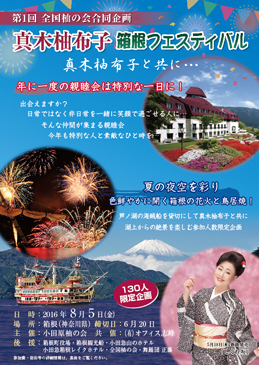 平成28年8月5日(金)に箱根山のホテル芦部ホールで真木柚布子フェスティバルが開催されました、全国から会員約130名ほど集まり、第1部はカラオケ大会で、第2部は真木柚布子ショウで盛り上がりました。8/11は真木さんの誕生日、そのお祝いもしました。又箱根町町長山口氏に大湧谷噴火の義援金を渡しました。夜は箱根海賊船貸し切りで鳥居焼き祭りの花火大会を観ました、皆んな喜んでいただき、小田原柚の会のメンバーも一生懸命おもてなしをし、頑張りました。又真木柚布子ファンクラブの皆さんで集まり盛り上がりましょう、本日はありがとうございました。