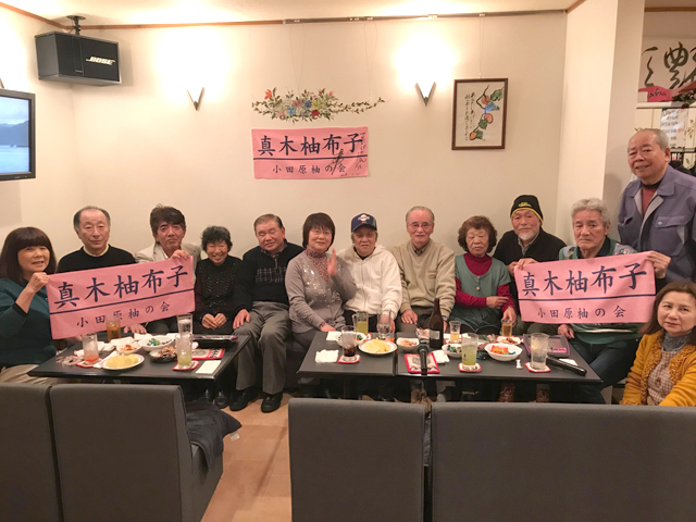 小田原柚の会では2カ月に1度第1木曜にフレンドパークで会合を持って、会員の親睦を持っています、5月定例会では会員21名が集まり、柴田会長より真木柚布子さんを会員一同で応援して行こうと話しあいました。又来年は小田原柚の会が「真木柚布子祭り」開催を東京、横浜、埼玉柚の会と協力していています。今年5/20−21の佐渡ツアーには9名が参加し、全国の会員と親睦を図って行きたいと思います。