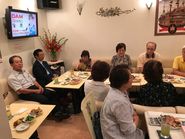 小田原柚の会が小田原フレンドパークにて真木柚布子さん来店(当日あんなに雨が降っていたのに来店時間には不思議に雨が上がり会員の方の来店に支障がありませんでした!)11:30から開催されました、会員24名が、参加、柴田会長より10/8に伝承ホールで真木柚布子特別公演があり、皆んなで応援に行こうと、又7/10には戸塚で真木柚布子夢劇場音楽祭があり小田原から4名が参加すると報告がありました。その後真木さんの歌があり、次に会員1人づつ紺屋高尾を歌い(先月先々月と、先生を招いて練習)優良可の採点があり、皆んな楽しくすごしました。次に真木さんのトークショウとなりました。その後和気藹々と二次会に移って楽しい一日となりました、真木さんマネージャーとお母さん有難うございました。