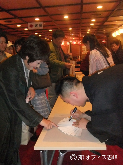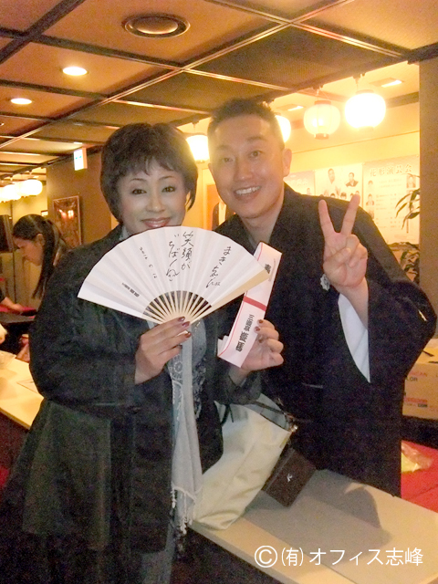 遊馬さんは、私のステージも良く観にいらしてくださっていて、とても気さくで、もちろん落語は最高。私もスケジュールが許す限り、落語を聞きに行っています。遊馬さんの扇子にサインをしていただき、2ショット(^^)v