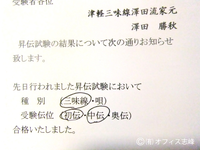 津軽三味線の昇伝試験の結果のハガキが届いた。