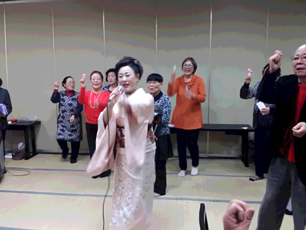 真木ちゃんの「ちょっと気恥ずかしい気がしますが新年会なのでおめでとうございます」の挨拶で始まり食事しながらのカラオケで盛り上がり真木ちゃんの歌謡ショー。拍手と笑い…最後に、はっぴーサンバで真木ちゃんの歌にみんなうろ覚えだが楽しく踊り、とっても盛り上がりました。